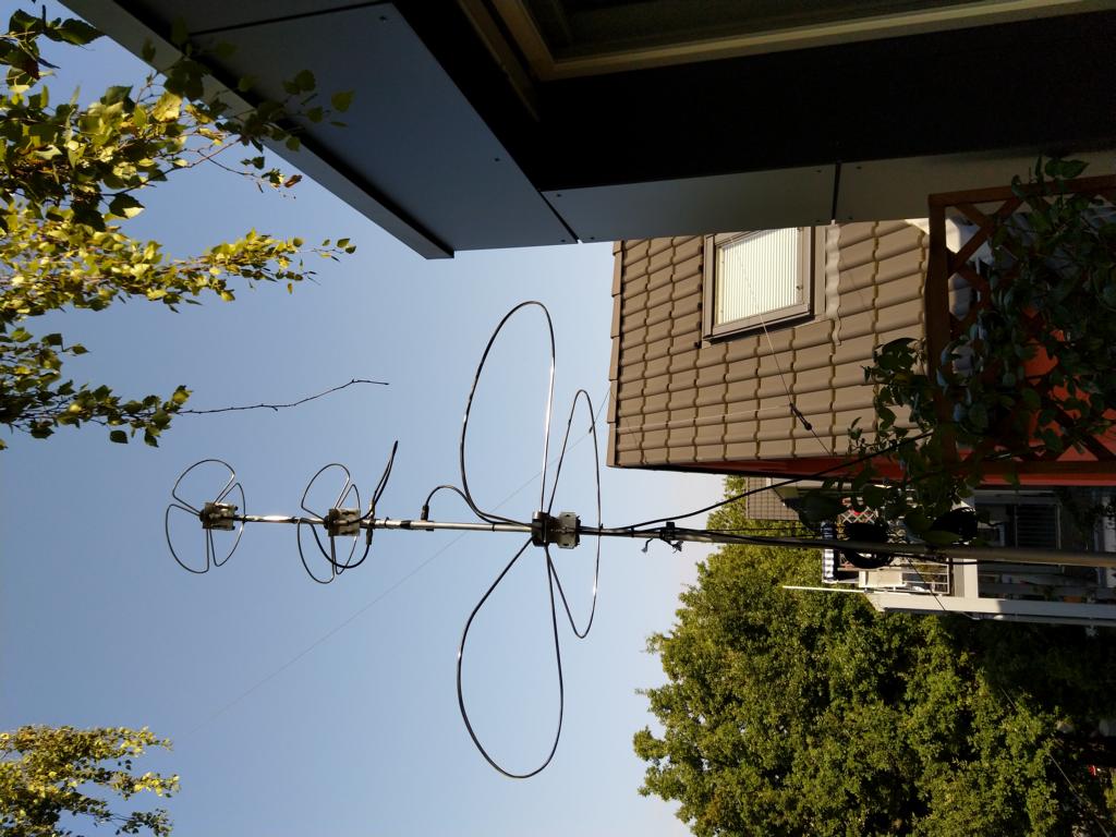 Da ich irgendwann angefangen habe auch auf UKW zu funken , um dem Club die nötigen Punkte zu bringen, (Kurzwelle und CW ist eigentlich meine Leidenschaft), hab ich meinen Möglichkeiten entsprechend nach Antennen gesucht die an meinem Standort möglich sind. Aygis kamen für mich wegen des Aufwandes nicht in Frage. Ich fand die BigWheels für 2m und 70cm, einen Ausziehbaren Alluschiebemast, den ich am Balkon befestigt habe. Die Durchführung unterhalb meines Dachlukenfensters waren kein Problem. Mein erster Versuch mir eine selbst zu bauen ist gescheitert, also kaufte ich sie nach und nach bei Wimo. beschrieben steht sie bei Rothammel und auf der seite von DO7PSL Sie ist ein fast idealer Rundstrahler und macht einen Gewinn von 3dB. Ich habe die 70cm gestockt, so dass sie 5dB gewinn versprechen. Damit kann ich Verbindungen bis zu 500km erzielen. Was will ich mehr? Der Vorteil im Contest. Die lästige Kurbeilei ist nicht notwendig.