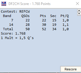 Hab nach längerer Pause wieder mal Am REF Contest teilgenommen. Die Letzten Jahre war es mir nicht so ohne weiteres möglich. Ich wollte auch den Contest nutzen um meine Probleme mit dem Rechner und der Erde zu berienigen. Ich glaube dass es mir gelungen ist. Da ging aber eine menge Betriebszeit drauf. Immerhin 50 Qsos und einmal Französisch Guyana.